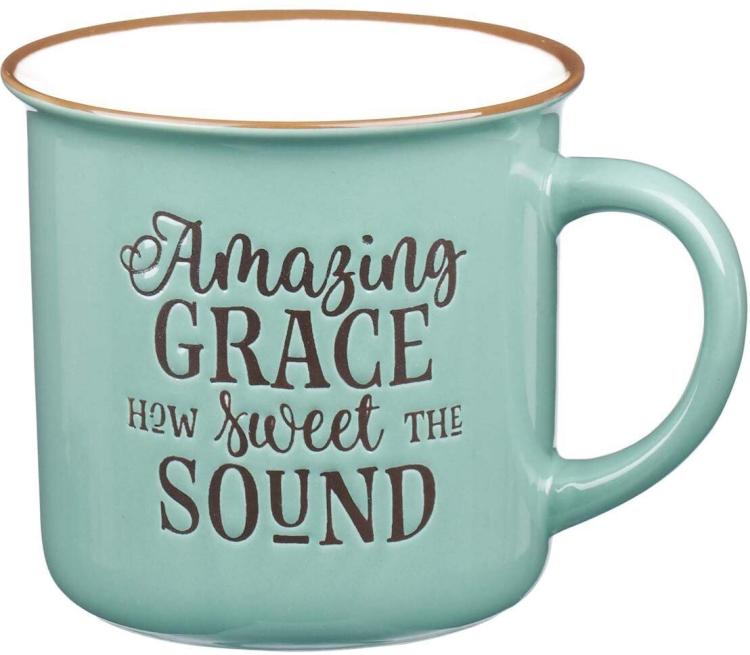 The ceramic Amazing Grace Mug comes in a deep mint color, features a rugged chipped look, and displays the words Amazing grace how sweet the sound. The brown rim and chips give the Christian mug an outdoorsy, camp-style feel.