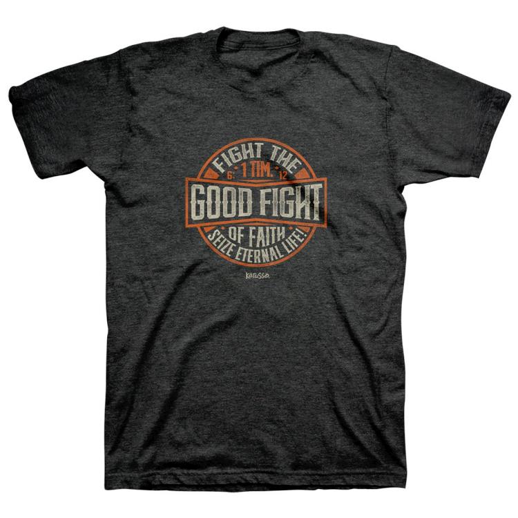 Seize the gift of eternal life and don t let go in this classic Fight the Good Fight Kerusso T-Shirt in Dark Heather. Rising to the occasion for our faith isn t a onetime thing God calls us to battle against the forces of evil round after round, upholding the name of the Lord God Almighty all the while. When we choose Jesus, we agree to a life of faith, calling on God in prayer and seeking His face, and His will, again and again.