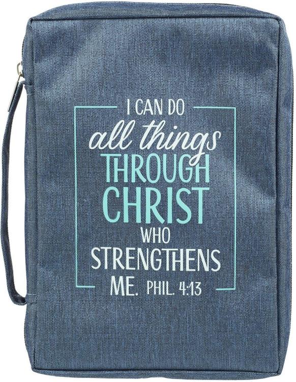 The Lord gives strength to those who seek Him. This denim blue canvas I Can Do All Things Bible Cover displays Philippians 4:13~ âI can do all things through Christ who strengthens me~â? with a laid-back and casual feel. Perfect for believers who enjoy keeping their Bible with them at all times~ whether itâs camping and hiking~ or just relaxing at home. The convenient carry case allows for easy carrying.
