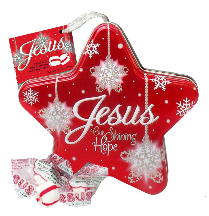 This beautifully embossed star-shaped tin features “Jesus Our Shining Hope.” Tin is filled with Old-Fashioned Soft Peppermints. Makes a great gift or beautiful Christmas decoration!