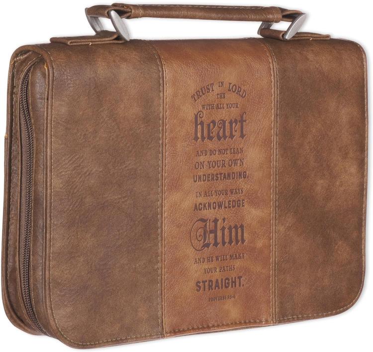 The Trust in the Lord Faux Leather Bible/Book case is a great way to carry around a Bible or a favorite book or textbook. The brown two-tone cover is heat-debossed with one of the Bible s most renowned Proverbs written in a variety of fonts from bold typewriter print to swirling, classical calligraphy and unabashedly stating,
