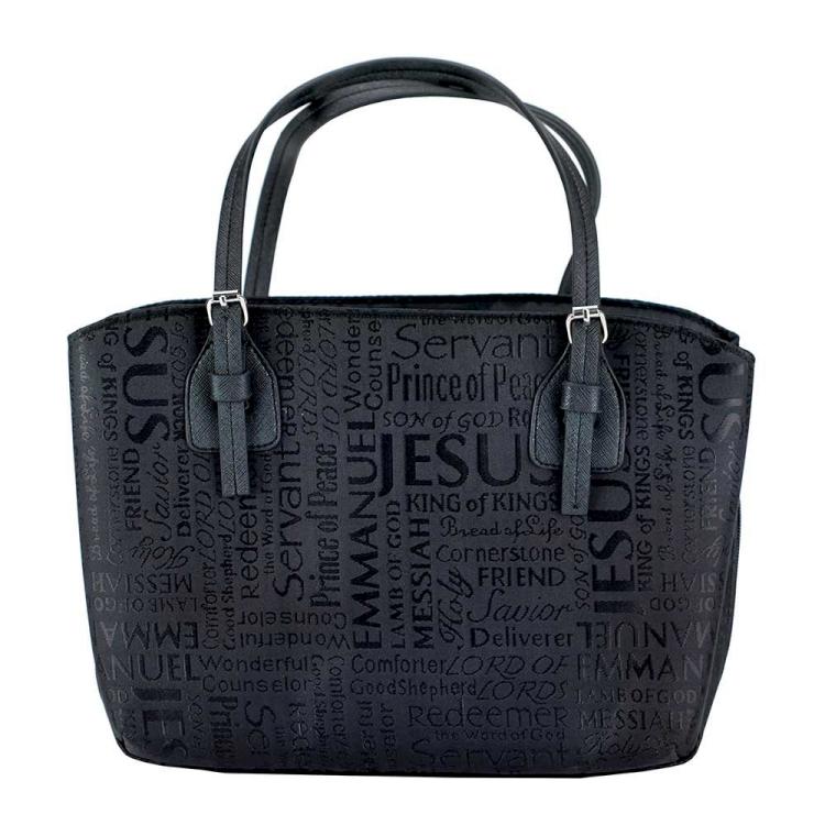 Handbag style Bible cover has a lovely subtle Names of Jesus pattern. Features buckle-accented purse handles and super roomy pockets on both sides, large enough to hold Bible study workbooks, pens and more! Magnetic snap closure for each. This is perfect for taking to a Bible study group or Sunday School. Outer material is sturdy, easy care textured vinyl; inside is lined with black water-resistant nylon. Has attached ribbon bookmark and loop for your pen or pencil. Comes in two sizes. Inner size dimensions: Large is 9 3/4 x 6 3/4 x 1 3/4 inches; X-Large is 10 1/4 x 7 1/4 x 2 inches.