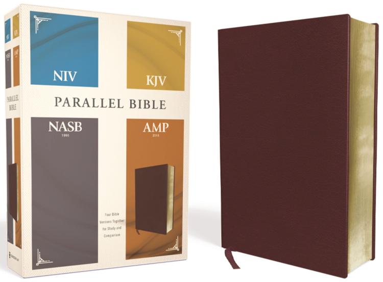 Four Bible versions together for study and comparison. When you don’t want to lose anything in the translation, the NIV/KJV/NASB/Amplified Parallel Bible is a tool that lets you explore the rich nuances of meaning in the Bible’s text without having to learn the original biblical languages. Compare and contrast four popular Bible versions side-by-side: the authenticity and accessibility of the accurate, readable, clear New International Version; the iconic grandeur of the King James Version; the structural insights of the New American Standard Bible (1995 text); and the explanatory alternate readings of the AmplifiedA(R) Bible (2015 Edition). Passages and verses from these versions are aligned in parallel columns for easy comparison and study. Features:Full text of the New International Version, King James Version, New American Standard Bible (1995 text), and Amplified (2015 Edition) set side-by-sideDouble-column formatRibbon marker7.8-point type size