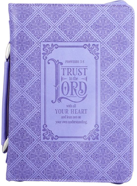 Inspire your loved one to continue trusting in the Lord with the lovely Proverbs 3:5 Purple Bible Cover, which includes the verse, Trust in the Lord with all your heart and lean not on your own understanding. Along with a quilted floral pattern, the verse text is elegantly debossed on the Christian Bible cover. Additional features include a cross engraved zipper pull, inside slip pockets, back slip pocket, two pen loops and a lay-flat spine handle.