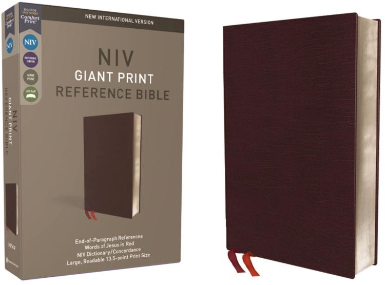 Let Scripture explain Scripture Featuring a giant, 13.6-point print size; a new, exclusive Zondervan NIV Comfort Print typeface; and an end-of-paragraph reference system – this Bible provides a clear, smooth, and easy reading experience for readers of all ages. Expertly designed for the New International Version (NIV) text, Zondervan NIV Comfort Print typeface delivers a smooth reading experience that complements the most widely read contemporary-English Bible translation. Ideal for anyone looking for a Bible that is gentle on the eyes, this NIV reference Bible includes:End-of-paragraph referencesComplete text of the accurate, readable, and clear New International VersionNIV dictionary/concordanceEight pages of full-color maps in the back of Bible for helpful referenceWords of Jesus in redTwo ribbon markersExclusive Zondervan NIV Comfort Print typefaceEasy-to-read 13.6-point print size