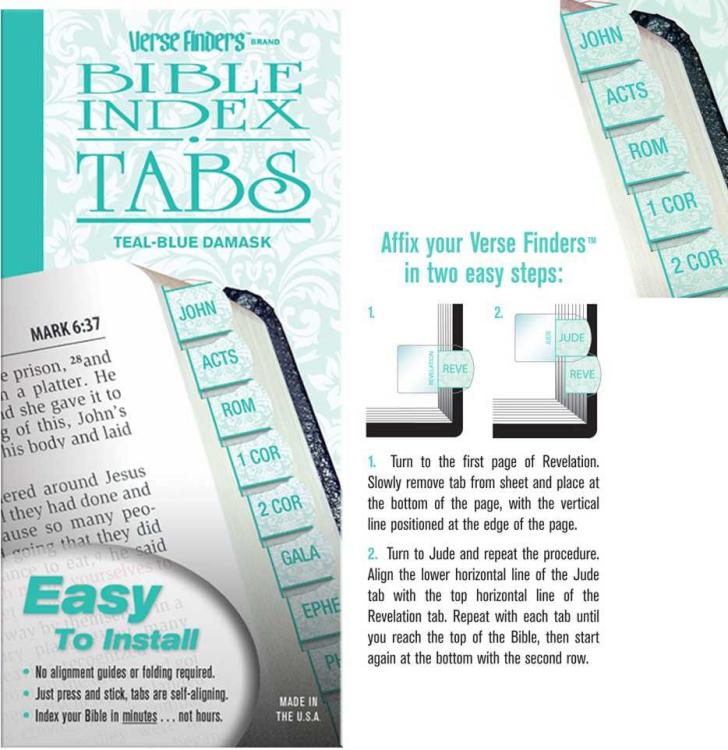 $5.99Features: Easy to install – no alignment guides or folding required. Just press and stick. Tabs are self-aligning. Index your Bible in minutes…not hours. Attractive and durable for years of trouble-free use. Horizontal style – reads left to right. Compact 3/8″ design indexes a standard Bible in only 2 rows, making books easier to find.